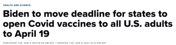近日,美国总统拜登宣布疫苗全民接种工作再加速,预计将于2021年4月19日完成全民接种。这个消息比之前公布的将在5月1日前完成所有成年美国人接种疫苗的目标,又提前了很多天。