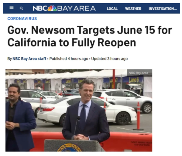 Newsom通过媒体发声,说“加州目前已经配置了超过2000万支疫苗,是时候让加州的经济进入新的轨道了。我们现在要开始计划疫情后的生活了,不过,我们要始终保持警惕,还是需要佩戴口罩,黑暗的尽头是光芒。”
